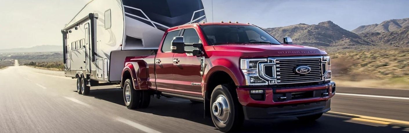 The F-250 and F-350 come standard with a 6.2-liter flex-fuel gas V8 engine that delivers 385 horsepower and 430 lb.-ft of torque. The F-250 models are paired with a TorqShift G six-speed transmission, whereas all the other models come with a TorqShift ten-speed automatic transmission. There are two more engine options for all the Super Duty trucks, including a 7.3-liter gas V8 engine that offers 430 horsepower and 475 lb.-ft of torque and a 6.7-liter Power Stroke V8 turbo diesel engine that produces 475 horsepower and 1,050 lb.-ft of torque.